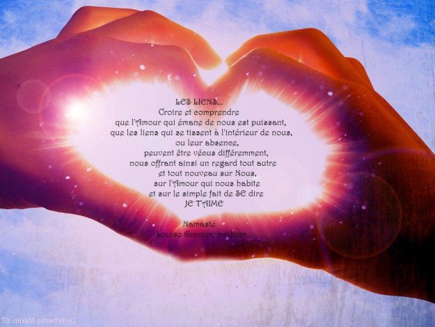 En savoir plusLa Souplesse LA SOUPLESSE….regarder à l’intérieur et laisser monter la douceur, accepter ces moments de joie et de grâce, qui nous rendent plus légers et nous apportent la paix de l’Âme et du cœur. Inspirée par Louise Grenier, médium Namasté Louise Grenier Médium et accompagnatrice en cheminement personnel