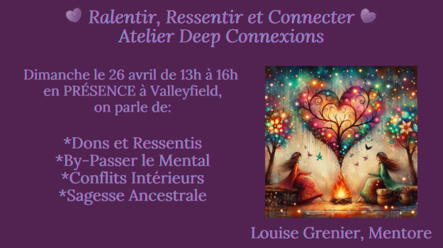 ♥Deep Connexions♥ 26 Avril 2026♥ en présence Atelier Workshop Exploratoire en groupe à Valleyfield en présence ♥♥♥ Viens vivre un moment puissant d’évolution! Ce qui t’es offert avec ce type d’Atelier, c’est une invitation à: ♥Ralentir, ressentir, te reconnecter à ton cœur, mettre le mental sur pause et laisser la sagesse de tes ancêtres t’accompagner…